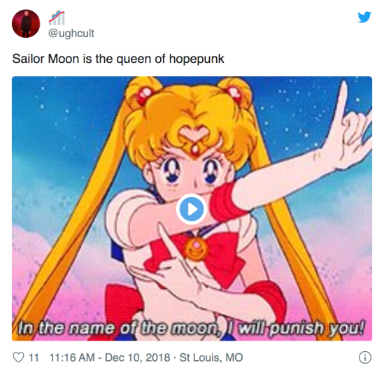 Hope might also require practices of radical imagination that re-envision both who and how otherwise possibilities come into being. Shows like Sailor Moon and She-Ra depict multiple kinds and creeds of rebels—they don’t replicate the trope of Trinity Syndrome often found in dystopian sci fi, but instead represent heroism as an ongoing process of choices you make to continue to opt in, with strength and skill measured by a number of diverse attributes. Nor is the solution so simple as good defeating evil. In juxtaposition to noblebright (think of The Fellowship of the Ring), transformation in hopepunk occurs through fundamental structural change, rather than the blithe belief that the transition of power from one party to another is an all encompassing panacea for a society’s ills.