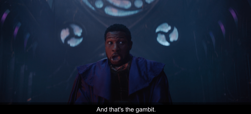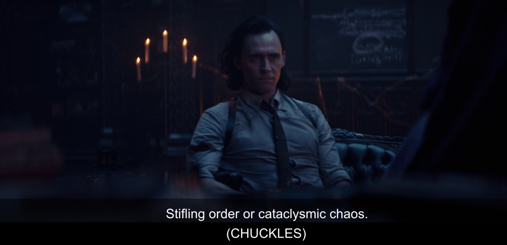 Kang admits that he’s a dictator and a conqueror—“We’re all villains here,” gesturing at Loki and Sylvie’s own checkered pasts. Yet Sylvie takes it a step further, calling him a liar. The TVA bureaucracy was founded on Kang’s own idea of order, innocence and stability, a cosmic harmony which nonetheless, in the words of Sylvie “treated people’s lives like some kind of game” (Episode 6). Kang presents the false illusion of binaries—order or chaos, benevolent ruler or utter destruction. To rule not only the world, but also the Multi-Verse, relies on his ability to dictate the narrative of time through a bureaucratic system operating within its own tautological scheme, one in which the employees will carry out orders without question, and his divine power to dictate the past, present and the future is treated as dogma.