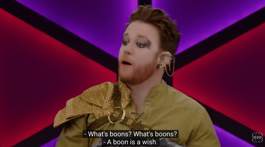 Effectively every person in actual play is actually two social constructs (at minimum): a player (the person sitting at the table and being seen and heard by the audience) and a character (the game identity of the individual, who is being portrayed by the player). Thus, when audiences experience episodes, they don’t have to divorce the player from the character – they can enjoy each as different sources of social input, or if they choose, they can conflate elements of the player with portions of the character (such as when one person is playing different characters). What that means is that players have to go through a degree of what Erving Goffman (1959) notes as impression management, where individuals influence how they are seen by others. In a prior piece at The Geek Anthropologist, I noted how impression management was important to “keep up appearances” in Zoom meetings during COVID. In actual play, the dynamic is different: impression management is done to maintain a distinction between the player and the character, particularly when you are seeing one person. Discursively, this is done through variation in pronouns, between first- and third person. For example, does the person at the actual play table say, “I open the door” or “Sedaris [their character] opens the door.” The player has the choice, and never loses the ability to step inside their character completely, or distinguish themselves as a player from the character (perhaps when the character is doing or saying something that the player would not). While Sean Hendricks (2006) noted how players alternate between first and third person in normal TRPG games, in actual play this modulation allows for recognition of the player and the character for the audience. The main difference is that there is more intentionality in this shifting because they know that another audience is watching