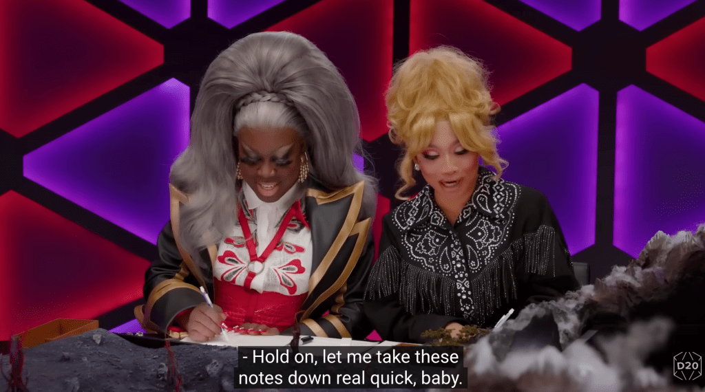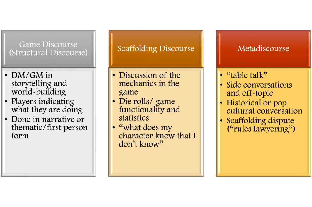 Lastly, layered discourse, or multiple levels of conversations occurring in the same social space, allows for different types of discourse to occur at the table to be recognized and appreciated by the audience. Specifically, I want to focus on two concepts: scaffolding discourse and metadiscourse. Scaffolding discourse is “where players engage in a conversation with the game master relating what their character does, and the mechanisms that allow the character to do this” (Dashiell 2020). For instance, if a player needs clarification on the rules of a game or wants to talk through strategies with others around the table, they would engage in scaffolding discourse. This scaffolding discourse is distinct from their voice and persona as a character in the game. Yes, the game is part storytelling, but some of it is dice rolling, descriptions, and rules adjudicating what is necessary for the game to progress. For example, a gaming party may need to go from one town to a city a hundred miles away. The discussion of how they get there, and what they need to get there, and how long it would take based on different movement speeds is a part of the process. Normally this conversation can be tedious for watchers, but in actual play scaffolding discourse is made more exciting with theatrical elements of comedy and performative improvisation (MacCallum-Stewart 2024). These elements invite the audience in, particularly to a conversation that serves the players as a reference group. Thereby, those discourses may be entertaining, rather than a dull discussion of rule and practice. Additionally, these conversations could be instructive for new audience members who might be new to the game or the show/podcast (given some actual play troupes have adapted or “homebrewed” systems that may be unfamiliar).